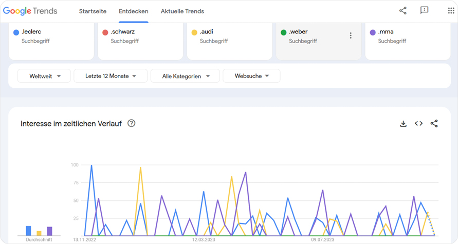 Das Ran­king der Digi­ta­len Unter­neh­mens­mar­ken 2023 kor­re­liert in die­sem Jahr nur zum Teil mit den Ergeb­nis­sen von Goog­le Trends: Die drei Unter­neh­mens­mar­ken .leclerc, .audi und .mma sind beson­ders sicht­bar in der Top 5‑Gruppe. Die Mar­ken .schwarz und .weber sind hin­ge­gen nicht sichtbar.